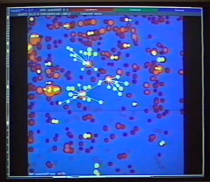 But tens of thousands of proteins can be expressed in a living cell. What is the best way to identify them — and how do we keep track of them all? In the late 1970s, a scientist at Cold Spring Harbor Laboratory, Jim Garrels, was hard at work on a way of doing this. Jim’s idea was based on an existing method, gel electrophoresis. As PDI explained later in a press release, “electrophoresis is a method for separating a complex biological mixture of proteins.” The proteins are run through a gel, and an electric current is then applied to the gel. The electricity causes the proteins in the gel to separate according to specific characteristics they have. Previously, scientists had been able to do one dimensional gel electrophoresis, which separated molecules out according to their size, and “could resolve a maximum of about 50 different proteins. Two-dimensional gel electrophoresis, which was developed in 1975, separates molecules according to both size and electrical charge. Each protein present in a cell extract leaves its own distinctive spot on the gel; more than 2,000 proteins can be resolved in a single trial. Because of this exquisite sensitivity, 2-D gels contain far more information than can possibly be analyzed by visual observation” (James I. Garrels Collection: Protein Databases, Inc., June, 8, 1984 press release “CSHL Licenses 2D Gel Technology”). In other words, 2D gel electrophoresis produces a visual representation with two axes, one for size and one for electrical charge, and depending on their size and charge, proteins will appear as spots on this picture.